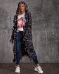 Μακρύ γιλέκο με κουκούλα και σκισμένο εφέ. Το γιλέκο έχει πλεγμένες λεπτομέρειες στο πλάι και δύο τσέπες στο μπροστινό μέρος.