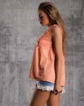 Μπλουζάκι με σετ κάτω από το μπούστο και διακόσμηση πλεκτή δαντέλα στα φλουριά και στις δύο πλευρές. Ο σχεδιασμός του tank top περιλαμβάνει επίσης κουμπιά με εφέ δαντέλας στη μία πλευρά, που είναι πιο κομμένη και διακριτικές επιγραφές στην άλλη. Μπορεί να φορεθεί και στις δύο πλευρές.