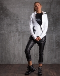 Σακάκι με έμφαση ζώνης στη μία πλευρά και ψεύτικες δερμάτινες λεπτομέρειες στους ώμους. Το σακάκι είναι στερεωμένο με διαγώνιο φερμουάρ και έχει οπές αντίχειρα στα μανίκια.