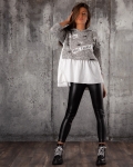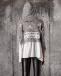 Πουλόβερ με εφέ μπλούζας με δέσιμο στο πλάι. Το πουλόβερ έχει κουκούλα και είναι διακοσμημένο με μπαλώματα με επιγραφές και εφέ βαφής.